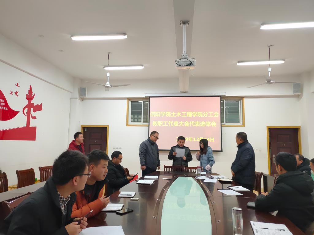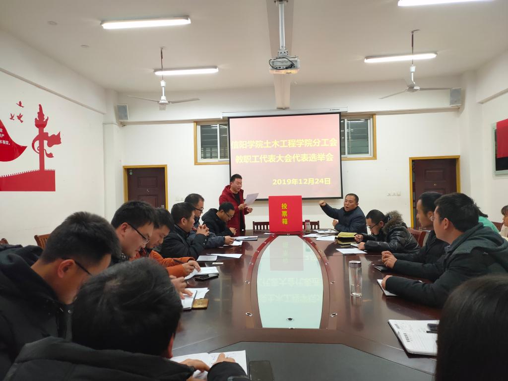 12月24日下午,土木工程学院在理工楼201会议室召开了信阳学院第一届教职工代表大会暨第一次工会会员代表大会代表选举大会,差额选举产生代表学院参加学校“双代会”的正式代表。会议由潘卫国主持。