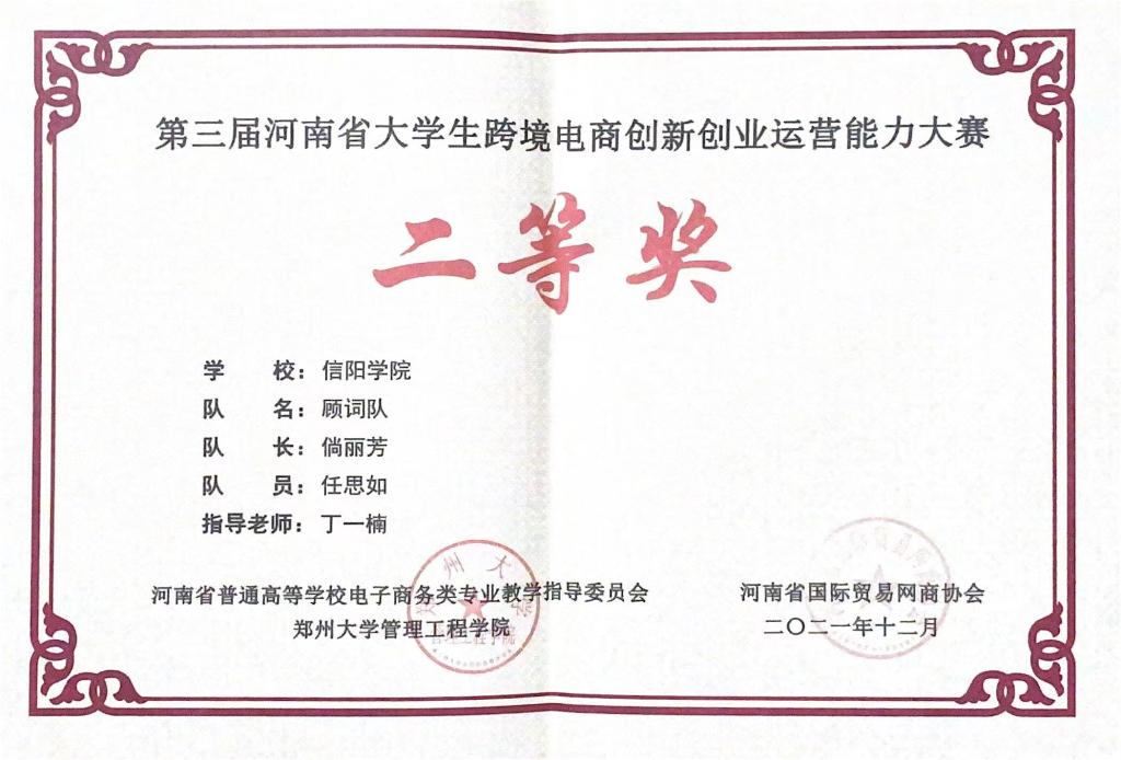 近日,由中国国际贸易学会、全国外经贸职业教育教学指导委员会主办的第三届河南省大学生跨境电商创新创业运营能力大赛圆满落幕。信阳学院两支代表队在丁一楠、杨蓓蓓老师的带领下经过三天辛苦的努力比拼,在河南省本科高校79支队伍中脱颖而出,荣获2个团体二等奖。