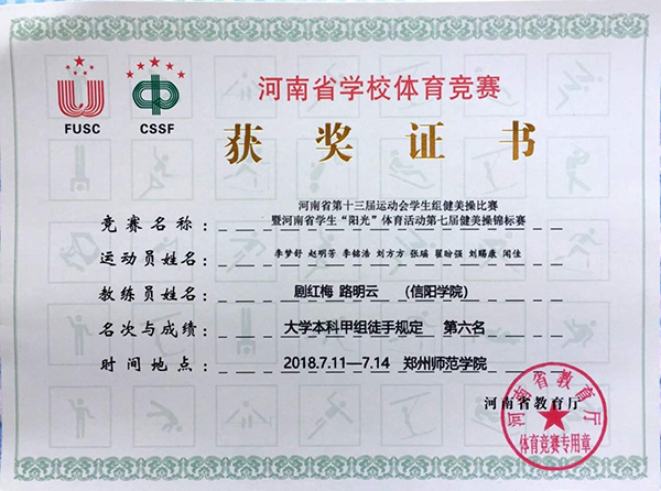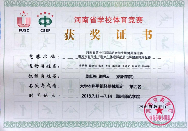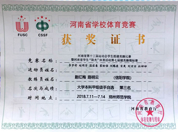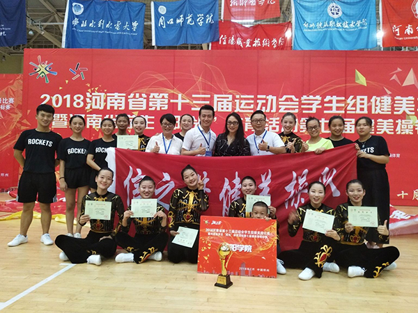 由我校16名同学组成的信阳学院信之梦健美操队,在公共体育教学部教师剧红梅、路明云悉心指导下,历时三个月的刻苦训练,秉承“更快、更高、更强”的体育精神,与来自全省的高校选手同场竞技。经过激烈角逐,我校代表队在赛场上的精彩表现得到了裁判员的一致认可,最终仅以毫厘之差获得本科甲组徒手自选第三名、本科甲组轻器械规定第四名、本科甲组徒手规定第六名。