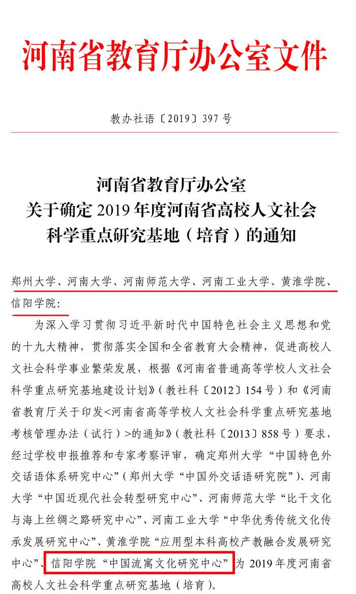近日,河南省教育厅发布《关于确定2019年度河南省高校人文社会科学重点研究基地(培育)的通知》(教办社语〔2019〕397号),确定我校“中国流寓文化研究中心”为2019年度河南省高校人文社会科学重点研究基地(培育)。这是我校内涵建设与特色发展取得的又一项高水平、开创性重大成就。