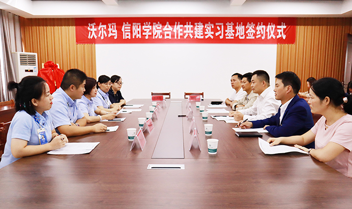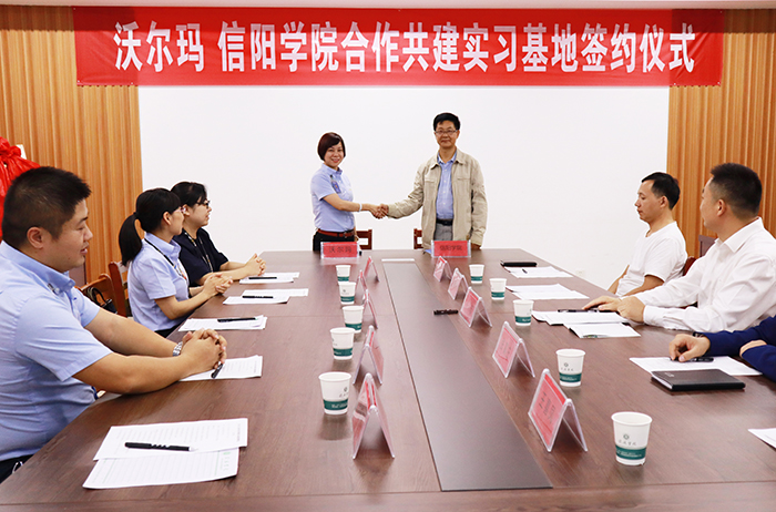 9月24日下午,我校与沃尔玛(河南)百货有限公司信阳人民路分店共建实习基地签约仪式在综合楼715会议室举行。校长助理张永志出席签约仪式。沃尔玛(河南)百货有限公司信阳人民路分店总经理张彩红、人力资源经理杨芮、资产保护部经理张雷、营运副总经理张春燕、HR经理助理洪敏,商学院院长刘建中、党总支书记张富庄和师生代表共同参加了活动。张富庄主持了签约仪式。