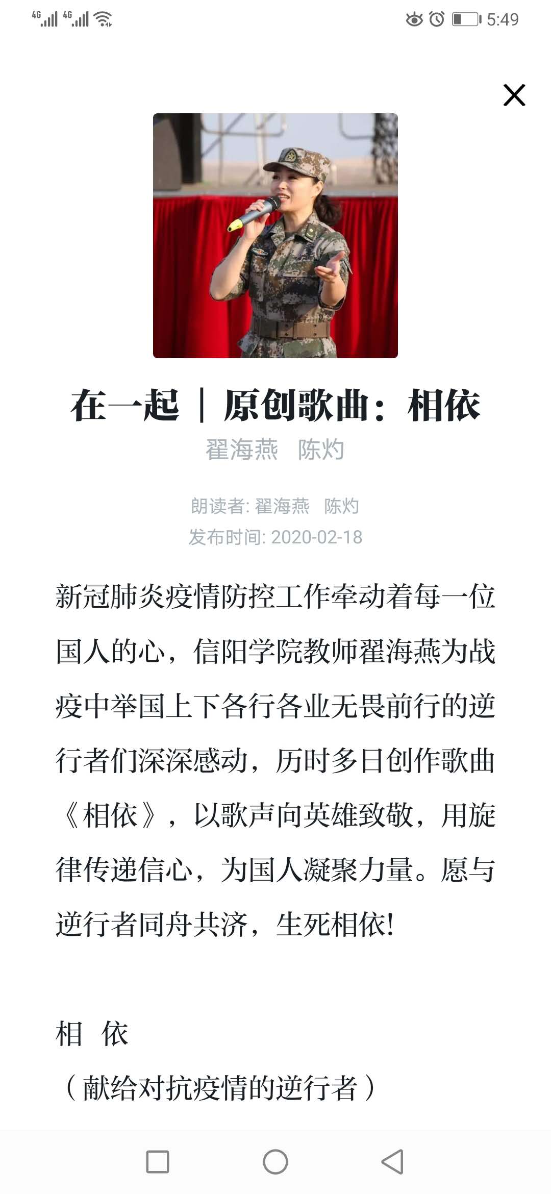 2月18日,由我校教育学院教师翟海燕作词作曲、 陈灼演唱的原创“战役”歌曲《相依》获学习强国平台推荐。