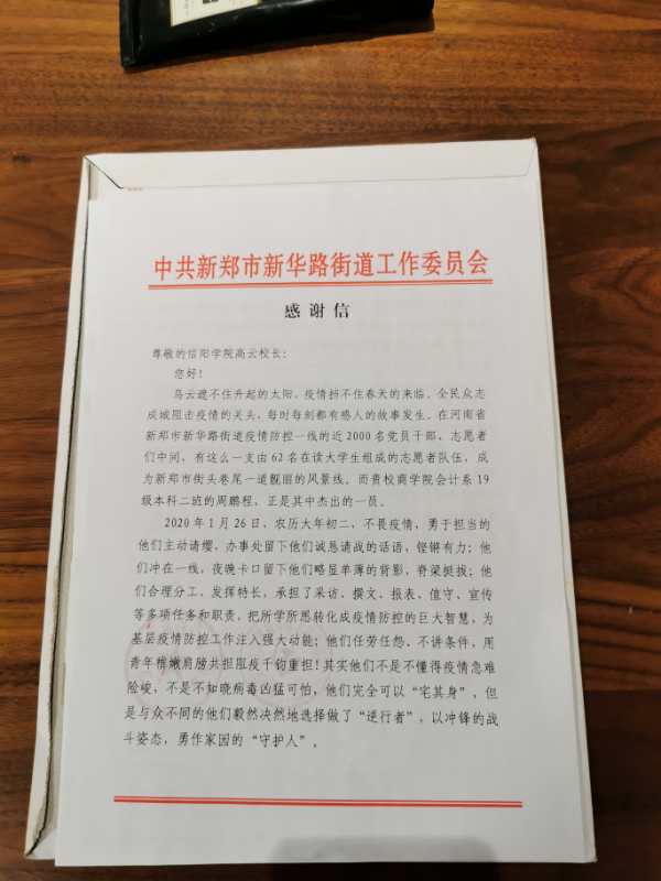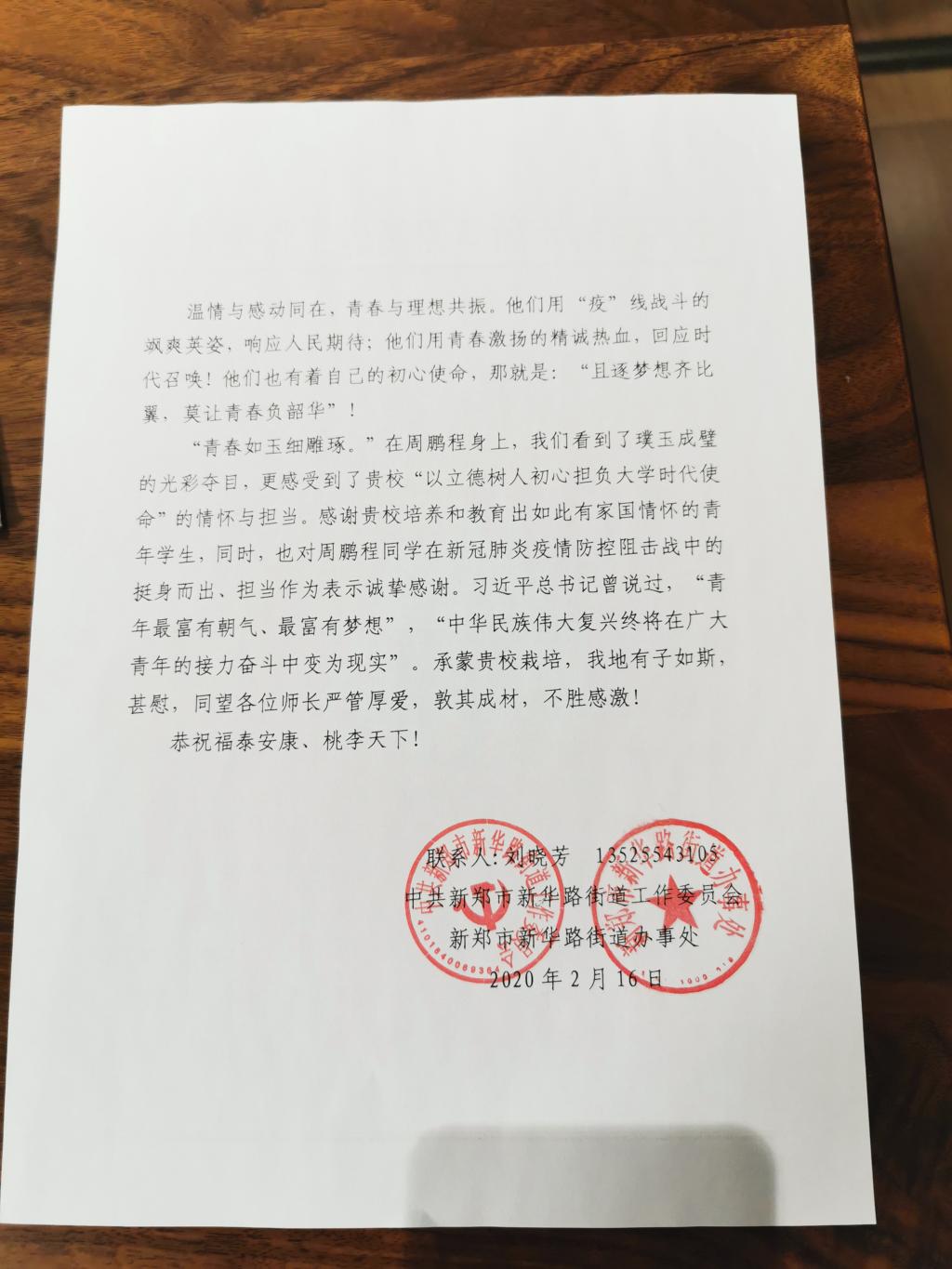 日前,我校理事长高云收到一封热情洋溢的感谢信。信件来自新郑市新华路街道工委,特意感谢我校培养的优秀学子--2019级商学院会计学本科2班周鹏程同学在寒假期间,面对来势汹汹的新冠肺炎疫情,“毅然决然地选择做了‘逆行者’,以冲锋的战斗姿态,勇作家园的‘守护人’。”
