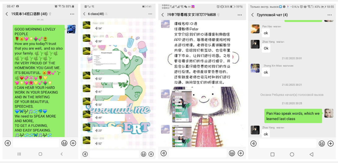 南非的Hoon Caro老师本学期负责外国语学院8个班级的英语口语课教学。她利用微信群,创新性地开展线上口语教学。她首先给同学们发送课程要求和要点解读,引导同学们进行口语交流和口语录音,认真分析录音,一一予以指正和鼓励。通过一部手机,心与心的交流显得如此亲切。Caro 老师对学生有积极的鼓励和赞美,也有善意的提醒和督促,与学生互动效果好。正如她所说,在教学组织中,学生的高度自律对于网络教学组织来讲格外重要,因此,她在教学组织中注重通过各种方式来要求学生加强自律,比如定期、定时给她通报学习情况、上交口语录音作业等。
