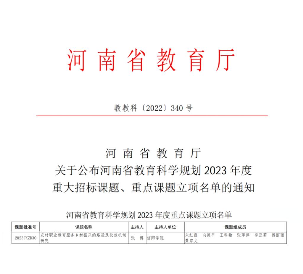 日前,河南省教育厅公布了河南省教育科学规划2023年度重大招标课题、重点课题立项名单。我校马克思主义学院教师张博主持申报的《农村职业教育服务乡村振兴的路径及长效机制研究》项目获批河南省教育科学规划2023年度重点课题立项。