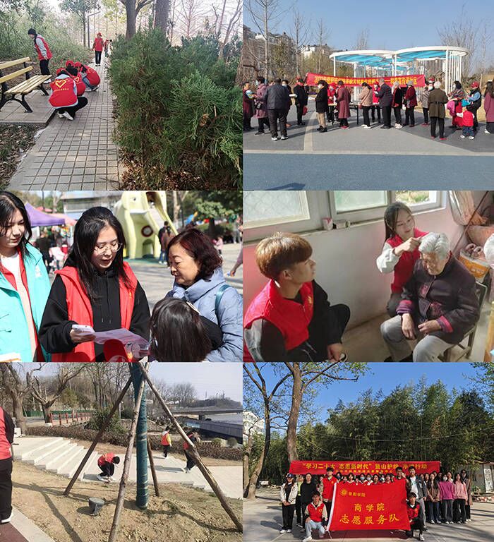 音乐学院、商学院、外国语学院、数学与统计学院、社会科学学院、教育学院志愿者分别来到信阳市奥林匹克公园、浉河公园、贤山、茶之韵广场、百花园、城关社区等多个地方,充分发扬不怕脏、不怕苦、不怕累的优良传统,清理每一个角落,不落下每一片垃圾,用实际行动践行公益环保理念,积极为文明城市建设添砖加瓦。文学院志愿者深入茗阳阁、彩虹桥、天伦广场,对老年团体进行防诈骗宣传、打扫街道卫生,并协助交警维护交通秩序。美术与设计学院志愿者来到信阳市五星乡街道办事处琵琶山社区,看望留守儿童和社区老年人,向小朋友送去了学习用品并耐心提供学业指导,热情帮助老年人打扫卫生、整理家务,得到了小朋友和老年人的点赞。在信阳市科技馆,理工学院志愿者引导参观者有序入馆,文明参观各个展区,并进行展品讲解,帮助参观者掌握科学知识、增强科学素质。