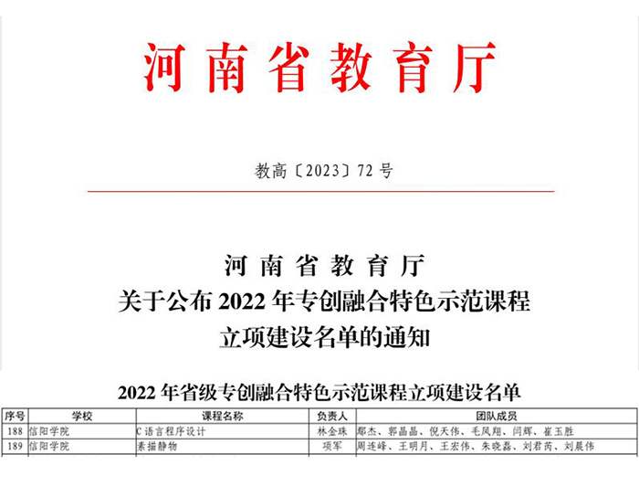 近日,河南省教育厅下发《关于公布2022年专创融合特色示范课程立项建设名单的通知》(教高〔2023〕72号)文件,我校大数据与人工智能学院林金珠副教授申报的“C语言程序设计”、美术与设计学院项军副教授申报的“素描静物”等2门课程获批立项建设。