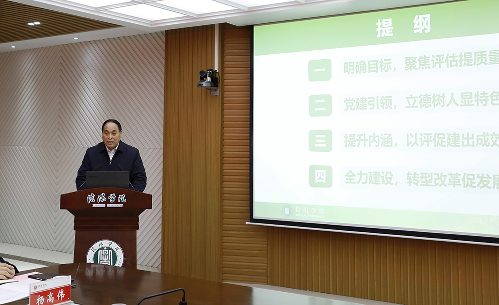 王北生汇报了学校近年来本科教学工作合格评估准备情况。一是明确目标,聚焦评估提质量。学校通过四年多时间全面加强建设,办学水平和实力有效提升,较好地达到了“四个促进、三个基本、两个突出和一个引导”的目标要求。二是党建引领,立德树人显特色。在办学治校过程中,注重加强党的建设,充分发挥党组织的政治核心作用和监督保障作用,协同构建“三全育人”大思政工作格局,打造“全员德育导师制”等系列思政工作品牌,建设信阳优秀传统文化传承馆并获批首批省级中华优秀传统文化传承基地等。三是提升内涵,以评促建出成效。学校认真自评,全力建设,打基础、强内涵,找差距、补短板,立标准、严程序,在办学条件、师资建设、学科专业建设、人才培养等方面实现了以评促建的目标。四是全力建设,转型改革促发展。学校站在新的发展起点,锚定区域经济社会发展需要与自身办学定位,将持续加大投入,奋力实现学校发展三大目标。