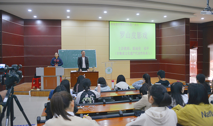 (罗山皮影戏代表性传承人陈雨伦、祁平来校授课)