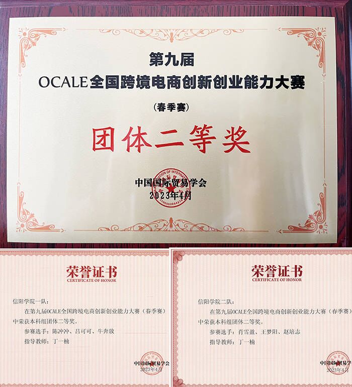 日前,由中国国际贸易学会举办的第九届OCALE全国跨境电商创新创业能力大赛成绩出炉。在来自全国26个省(市)、自治区共148所本科院校、716支参赛队中,信阳学院两支参赛队在丁一楠老师的带领下,经过3天、12个回合的激烈角逐,荣获团体二等奖。