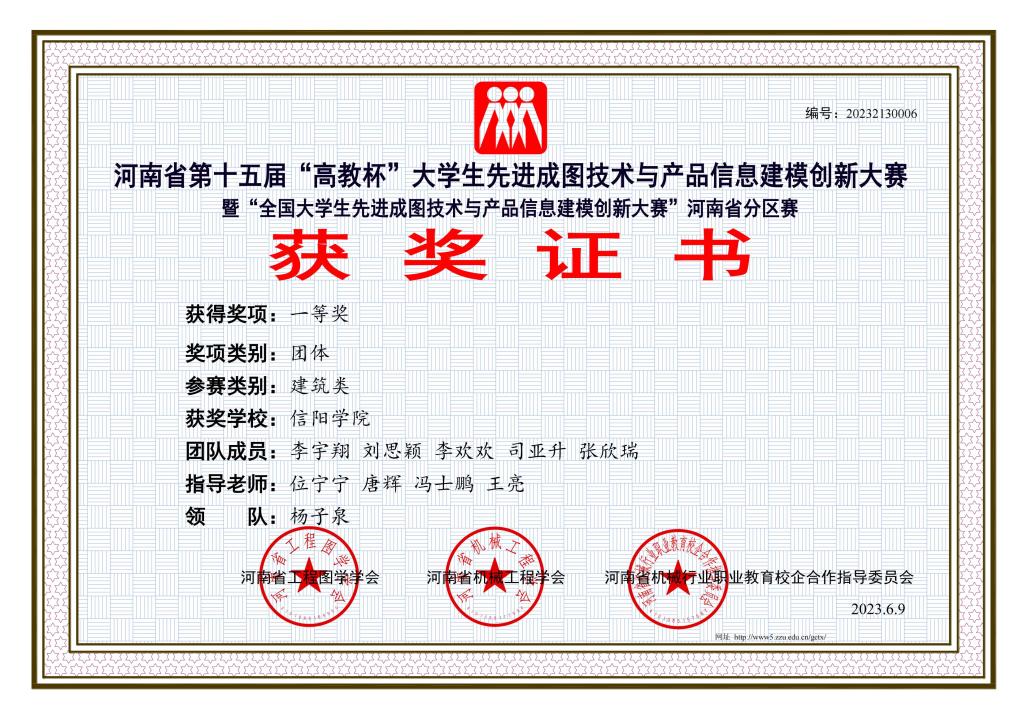 在河南省工程图学学会主办、郑州大学承办的河南省第十五届“高教杯”大学生先进成图技术与产品信息建模创新大赛(暨“全国大学生先进成图技术与产品信息建模创新大赛”河南省分区赛)中,我校土木工程学院代表队荣获建筑类团体一等奖1项、建筑类个人全能一等奖1项、个人全能二等奖7项、个人全能三等奖10项,指导教师获优秀指导教师一等奖2项,二等奖6项。
