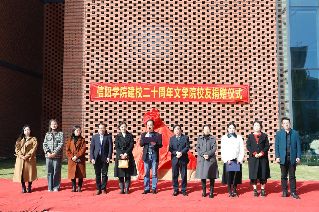 栉风沐雨二十载,坚守初心续华章。在信阳学院建校20年之际,学校文学院校友2013级李玲玲、2014级欧阳利妍、2015级杜志洋、杨柳、严瑞等向母校赠送一方镌刻着“博雅”的文化石,以感谢和铭记母校的培育之恩和恩师的教诲之情。11月16日上午,捐赠仪式在南湖校区文学院教学楼报告厅前举行。学校党委专职副书记施昌海出席捐赠仪式。校友办、宣传部、团委等部门负责人,文学院领导班子成员、校友代表、师生代表等参加了本次活动。文学院院长毛正天主持了捐赠仪式。