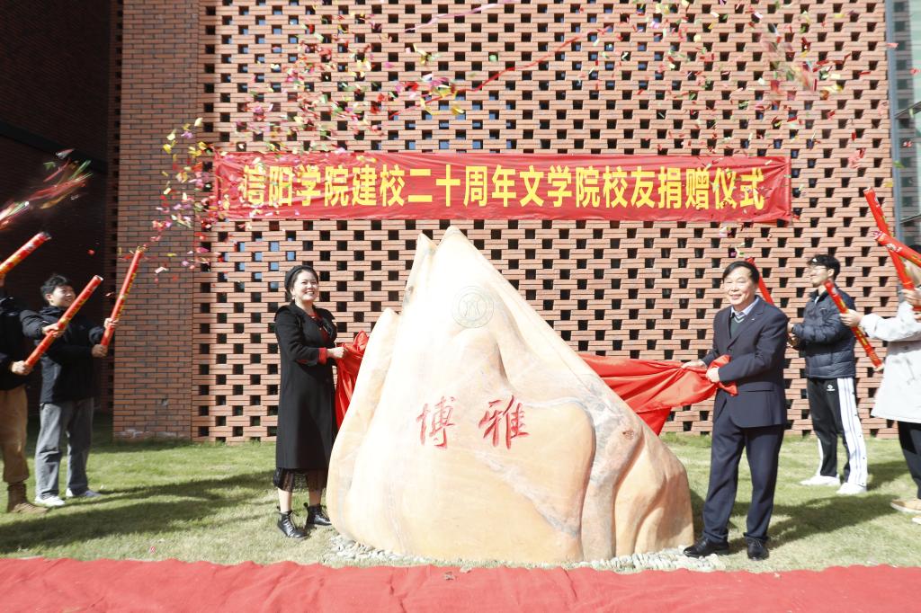 施昌海发表讲话,代表学校向心系母校的文学院校友表示诚挚感谢。他说,在母校20岁生日之际,文学院校友怀着对母校和师长的深情厚谊以及对学弟学妹们的热情关爱,慷慨解囊,特意向母校捐赠一尊美丽的文化石,是一项非常有意义的善举。这为本就高端大气的新校园平添了一抹亮丽色彩,增强了校园文化魅力。