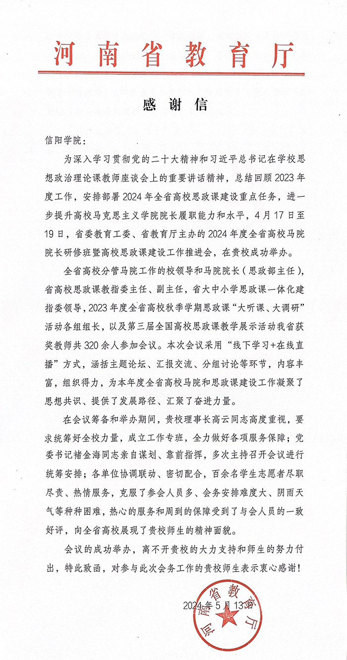近日,河南省教育厅向我校发来感谢信,肯定我校为承办2024年度全省高校马克思主义学院院长研修班暨高校思政课建设工作推进会所做出的积极贡献。