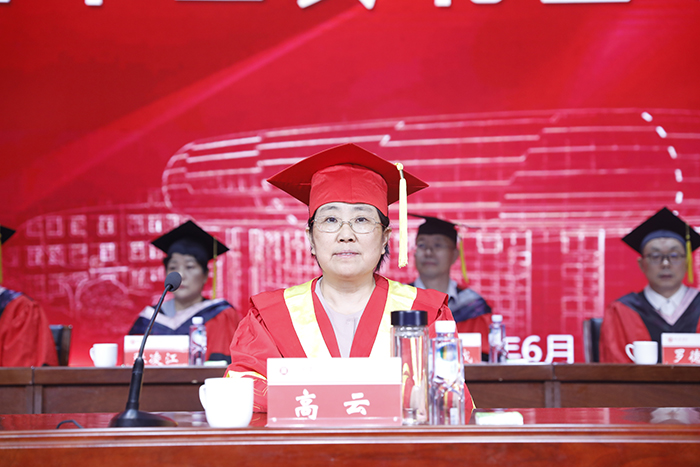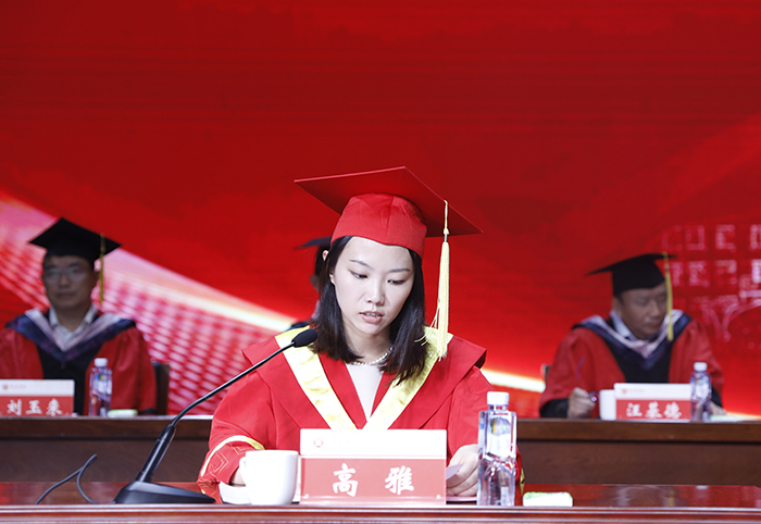 颁奖典礼结束后,高云、王北生等校领导和校学位评定委员会委员共同为2024届毕业生代表授予学位,正冠拨苏。