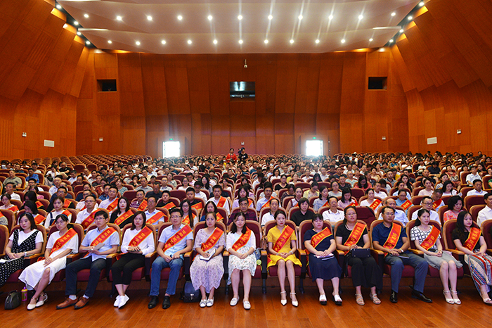 新学年伊始与第35个教师节即将到来之际,9月1日上午,学校2019-2020学年教职工大会暨教师节表彰大会在音乐厅隆重召开。名誉校长王北生,专职副书记施昌海,常务副校长傅洪涛,副校长王志华、王强,工会主席、校长助理高雅,纪委书记、校长助理杨高伟,校长助理张永志出席会议。全校各位专家、各级领导、全体干部教师和部分学生代表参加了会议。