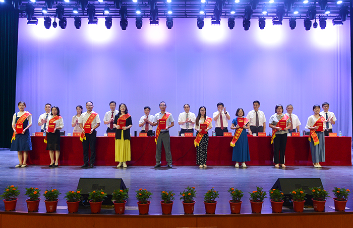 施昌海宣读了《关于表彰2018-2019学年优秀共产党员、优秀党务工作者和先进基层党组织的决定》《关于表彰2018-2019学年优秀导师的决定》等文件。其中,张猛荣获“河南省高等学校优秀党务工作者”,郑山峰等75名共产党员、郭二军等23名党务工作者、文学院党总支等5个党总支和外国语学院教工第一党支部等6个党支部分别荣获学校“优秀共产党员”“优秀党务工作者”和“先进基层党组织”称号;曹艳贞等54名导师荣获学校“2018-2019学年‘优秀导师’”。