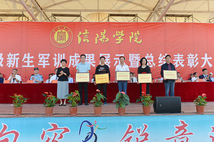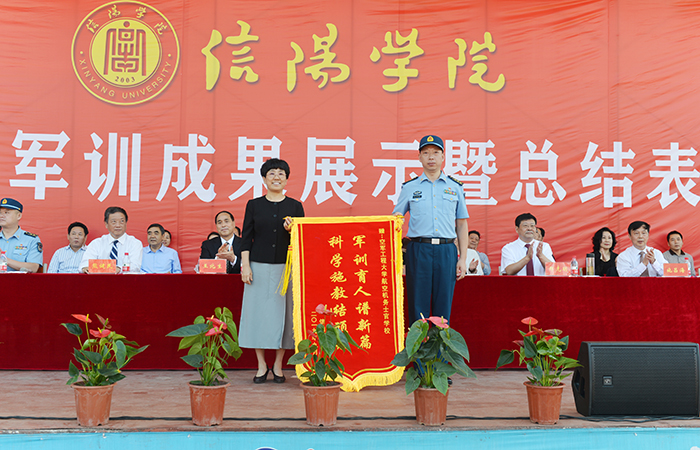 展飒爽英姿,扬青春风采。9月23日上午,学校2019级新生军训成果展示暨总结表彰大会在体育场隆重举行。空军工程大学航空机务士官学校学员二大队大队长孙豫龙上校、干事张涛中校,信阳学院理事长高云,名誉校长王北生,党委书记,战略发展咨询委员会主任熊健民,专职副书记施昌海,副校长王志华、王强,工会主席傅洪涛,校长助理高雅、杨高伟、张永志出席大会。承训教官,各学院院长、书记,各部门负责人,专家、教授、博士代表和2019级全体新生参加了大会。王志华主持了大会。