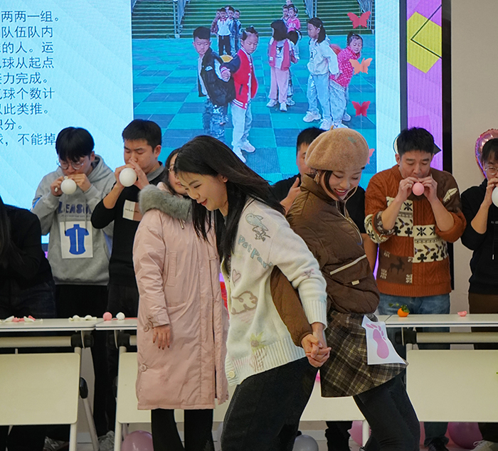 本次活动现场布置温馨浪漫,充满青春活力。在主持人的引导下,青年教师通过趣味组队迅速打破陌生感,随后参与了“叠杯子”“气球保卫战”“背对背拥抱”“杯水传情”等互动游戏。教师们热情投入,在轻松愉快的氛围中展现风采,欢笑声与掌声此起彼伏,陌生面孔逐渐变得熟悉,真挚情谊在互动中悄然滋生。