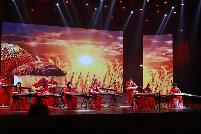 步入“铁血抗争铸脊梁”篇章,旋律陡然激昂:情景朗诵《这束光》以青年对话的形式,让不同时代的热血青春隔空共鸣,诠释出青年对引领民族前行的“希望之光”的思考与感悟;《在太行山上》《保卫黄河》的混声合唱气势如虹,钢琴协奏曲《黄河协奏曲・黄河愤》奏响抗争的强音,男声合唱《弹起我心爱的土琵琶》《游击队歌》则洋溢着乐观昂扬的战斗情怀,共同谱写了中国共产党领导下军民奋勇抗敌的英雄史诗;而《军民大生产》《纺线线》《南泥湾》的轻快节奏与古筝合奏《丰收锣鼓》的喜悦氛围,又将革命先辈自力更生、军民同心的奋斗场景娓娓道来。