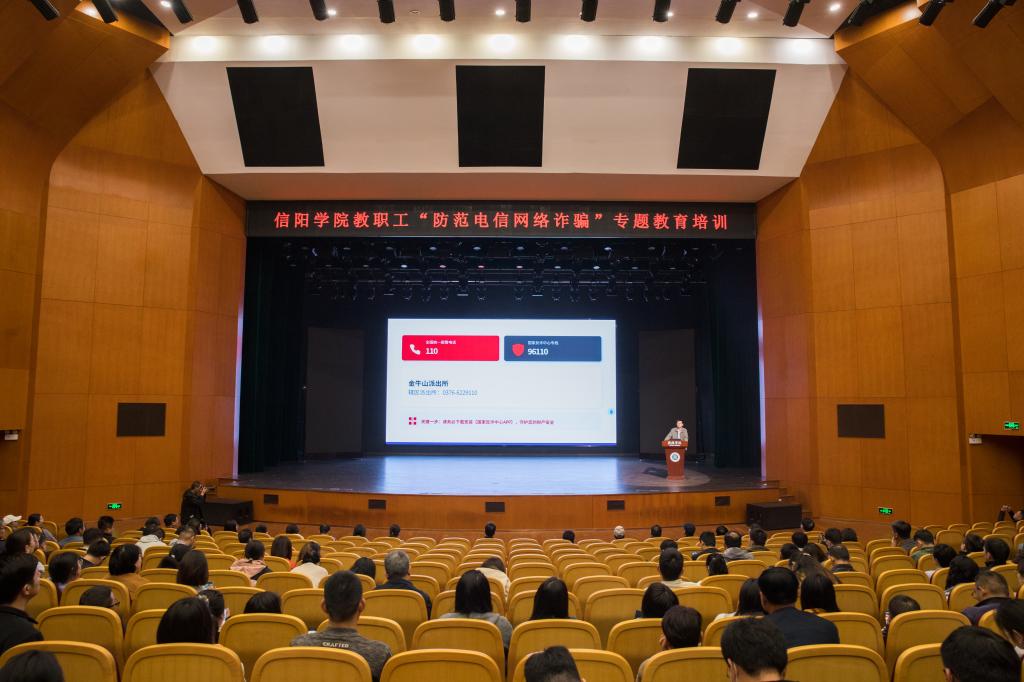 为切实提升全体教职工识诈、防诈、拒诈能力,有效防范化解校园电信网络诈骗风险,守护师生财产安全,筑牢校园安全稳定防线,4月14日下午,学校在音乐厅举办教职工防范电信网络诈骗专题教育培训。浉河公安分局民警井天宁受邀担任主讲嘉宾。副校长王志华出席活动。各二级学院党总支书记、院长,各部门负责人及全体无课教职工参加培训,后勤保卫处负责人主持活动。