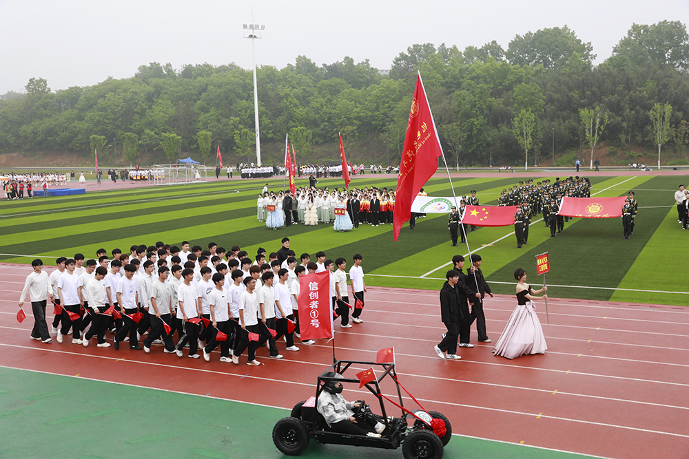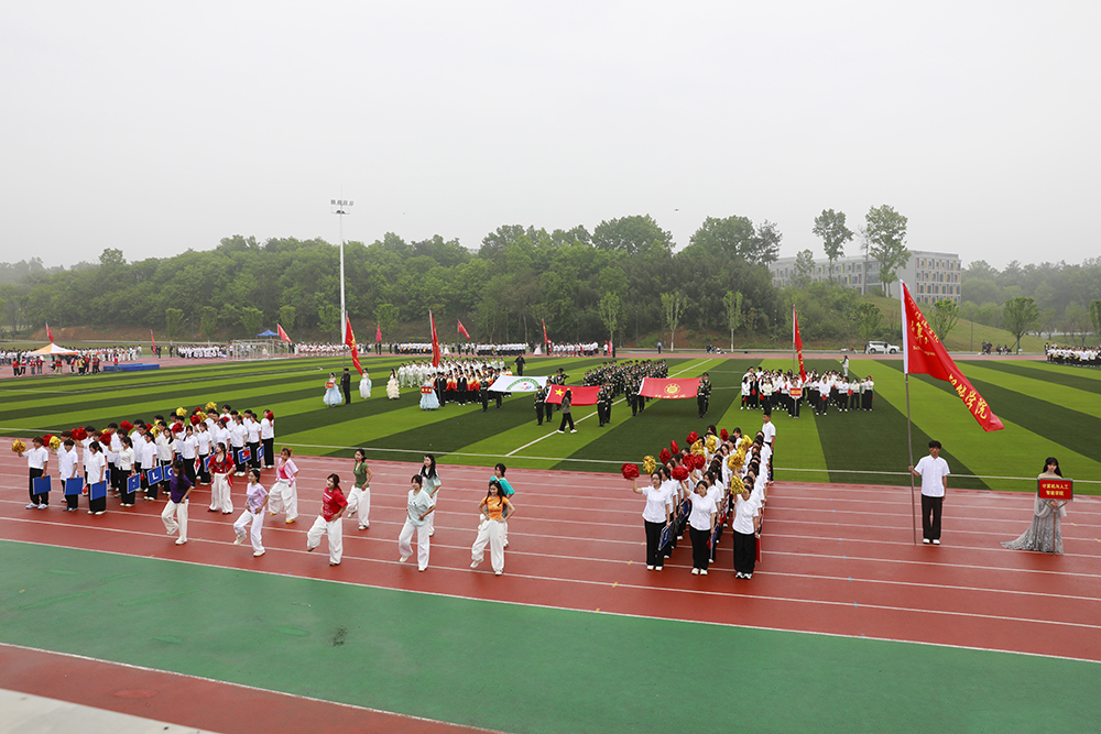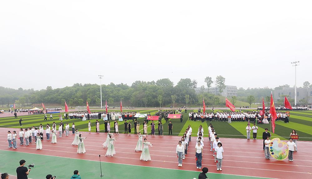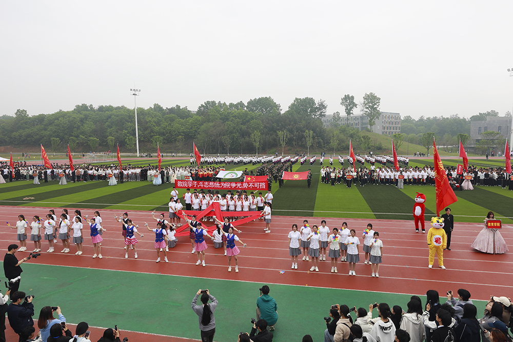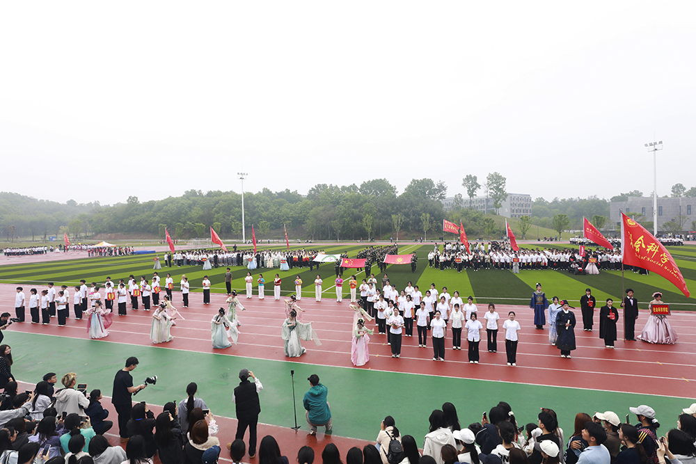 伴随着激昂的《运动员进行曲》,国旗、校旗、会旗、裁判员方队和马克思主义学院、文学院、计算机与人工智能学院、商学院、机电与汽车工程学院、物理与电子工程学院、生物与化学工程学院、美术与设计学院、社会科学学院、外国语学院、音乐学院、智能建造学院、数学与统计学院、教育学院等14个学院的运动员方阵迈着铿锵整齐的步伐,精神抖擞、意气风发地依次入场。各队伍表演构思新颖、独具特色,嘹亮口号、灵动队形与精彩展演充分展现学子昂扬风貌,赢得现场阵阵喝彩。