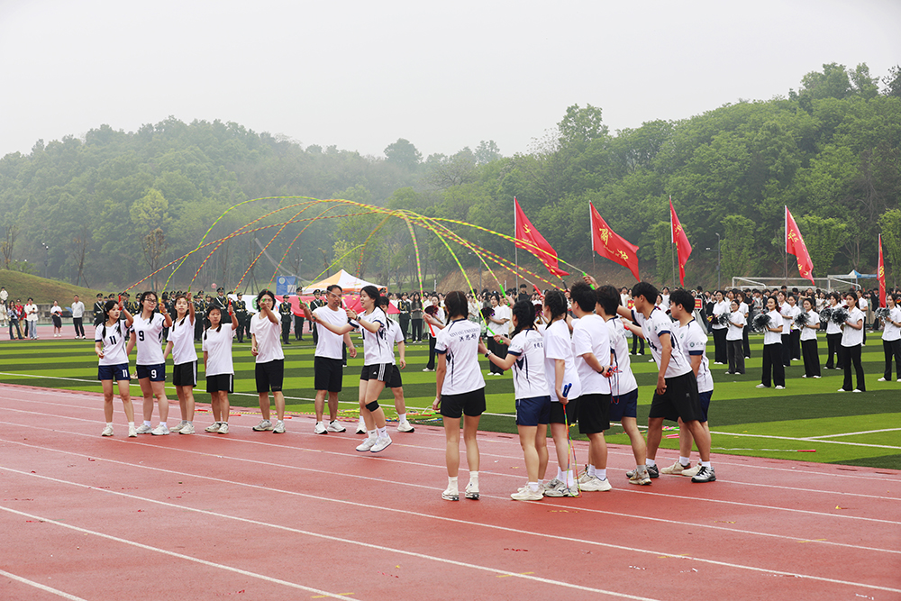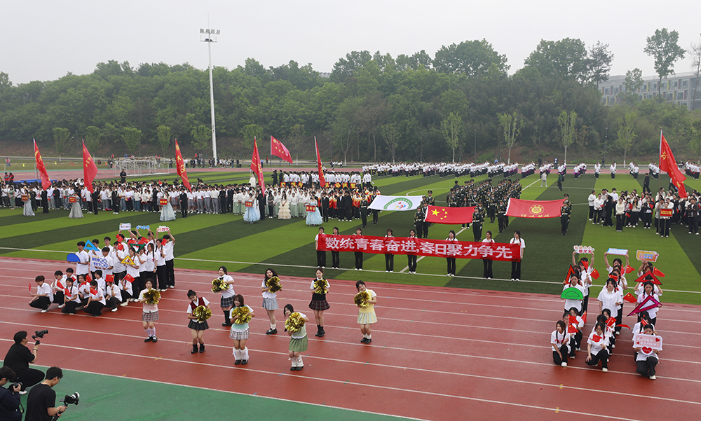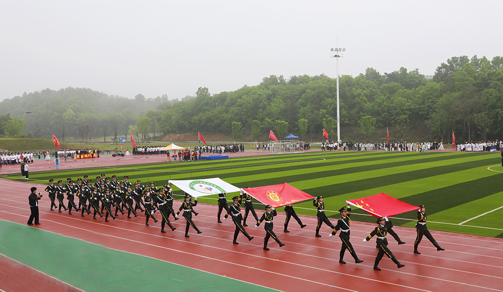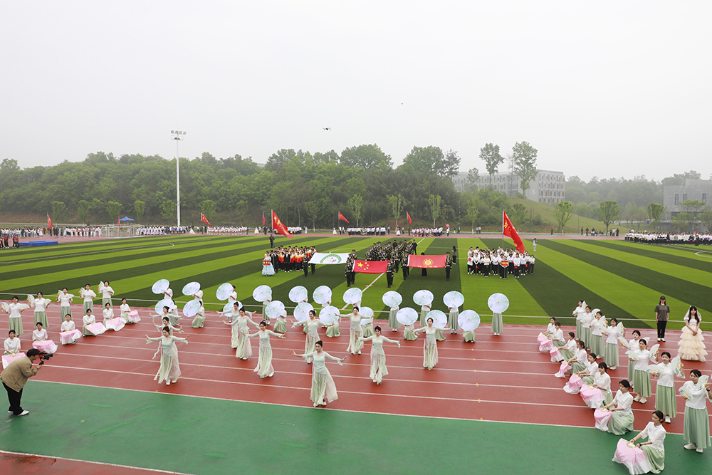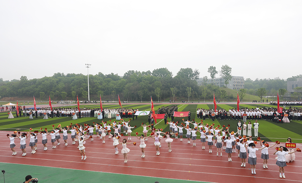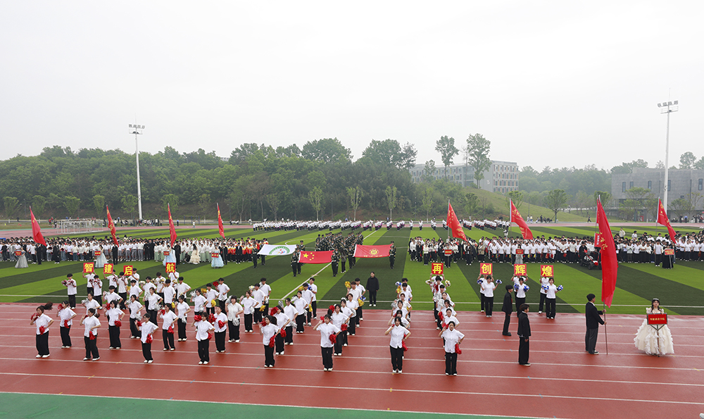 伴随着激昂的《运动员进行曲》,国旗、校旗、会旗、裁判员方队和马克思主义学院、文学院、计算机与人工智能学院、商学院、机电与汽车工程学院、物理与电子工程学院、生物与化学工程学院、美术与设计学院、社会科学学院、外国语学院、音乐学院、智能建造学院、数学与统计学院、教育学院等14个学院的运动员方阵迈着铿锵整齐的步伐,精神抖擞、意气风发地依次入场。各队伍表演构思新颖、独具特色,嘹亮口号、灵动队形与精彩展演充分展现学子昂扬风貌,赢得现场阵阵喝彩。