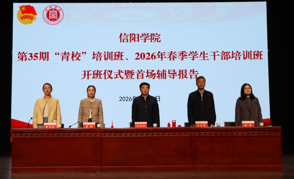 为深入学习贯彻习近平新时代中国特色社会主义思想,不断提升青年学生政治理论素养,4月21日下午,我校在音乐厅举行第35期“青校”培训班、2026年春季学生干部培训班开班仪式暨首场辅导报告。党委书记江玉安、副校长王志华出席会议。党委办公室主任娄琪、党委组织部部长杜倩、团委书记余婷婷、各学院团总支书记和学员代表在主会场音乐厅参会,其余学员在分会场同步参加。开班仪式由王志华主持。