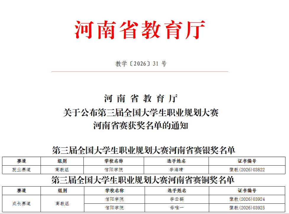 近日,第三届全国大学生职业规划大赛河南省赛成绩揭晓,我校学子荣获1银2铜佳绩,计算机与人工智能学院李海晴同学荣获高教组就业赛道银奖,教育学院李云鹤同学、计算机与人工智能学院母唯一同学荣获高教组成长赛道铜奖。