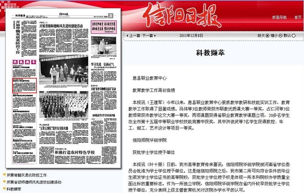 该报对我院近日被河南省学位委员会批准为学士学位授予单位进行了深入报道,报道指出,“这是继信阳师院之后,我市第二所可向符合条件的毕业生颁发学士学位证书的高等院校,获批学士学位授予权是体现一所本科院校办学质量全面达标的重要标志。作为一所独立学院,信阳师院华锐学院在省内外较早获批学士学位授予单位,充分表明上级主管教育机关对该院办学水平的认可。”