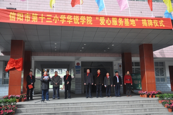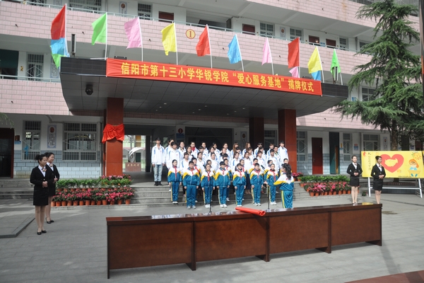3月23日下午,我院青年志愿者服务基地挂牌仪式在信阳市第十三小学隆重举行。院长郑定豪,党委书记祝军,浉河区委副书记李伟,副区长张勇,区教体局局长殷世明,区教体局工委主任巴世红,市十三小学校长王秀娟,我院艺术系主任张维,副主任张甲楠及艺术系青年志愿者代表、十三小学师生代表近千人参加了启动仪式。