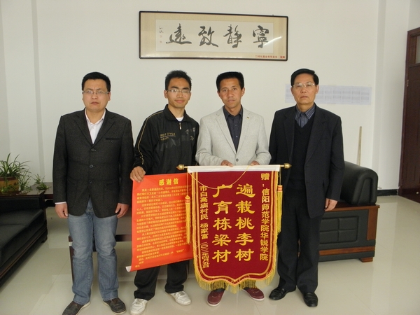4月5日上午,信阳市浉河区白高庙村村民杨先生携全家带着锦旗和感谢信,来校感谢社会科学系2010级法学班学生王志斌 “见义勇为”的义举。
