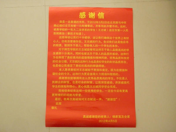 杨先生于3月2日中午,行至信阳市北京路与中环路交叉口时,被一辆机动车撞倒后昏迷不醒。在肇事司机及路人未给予救助的紧急情况下,我院王志斌同学当即拨打了“120”急救电话,并配合“120”急救人员及时将伤者送往市第一人民医院进行救治,现在伤者已痊愈出院。伤者及家属为感谢王志斌同学在危机时刻给予的帮助,特来校向学生及学院表示感谢。
