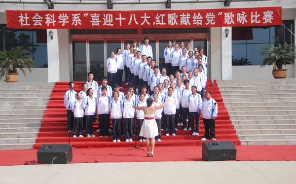 10月28日上午,“喜迎十八大,红歌献给党”歌咏比赛在教三楼广场举行,千余名师生参加了此次活动。参赛同学们着装整齐、精神焕发,他们满怀为党的十八大献礼的喜悦心声,站列成镰刀斧头的“党徽”和数字“十八”等队形,以嘹亮的歌喉演绎了《走进新时代》、《歌唱祖国》、《国家》等爱国歌曲,为即将召开的党的十八大献礼。据悉,信阳电视台将对该活动进行新闻报道。