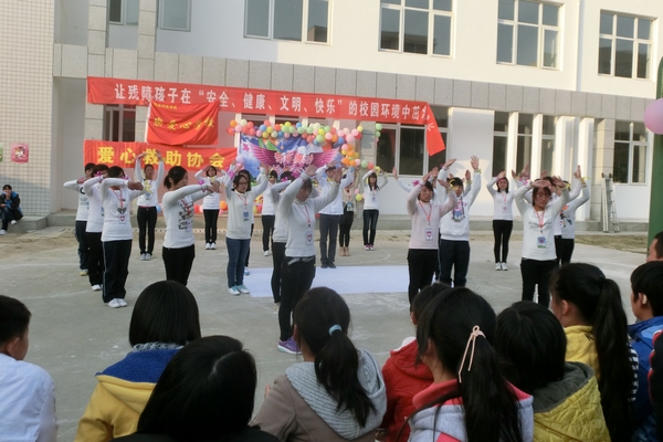 11月18日,由我院外语系爱心救助协会、信阳市团市委、信阳师院爱心学校、信阳市特殊教育学校共同举办的以“牵手舞动、愉悦心动” 为主题的关爱残疾儿童爱心活动在信阳市特殊教育学校举行。信阳市青联委员、青年协会副会长、全国优秀志愿者王向亚,团市委、信阳师院、特殊教育学校和我院有关领导、老师参加此次活动。
