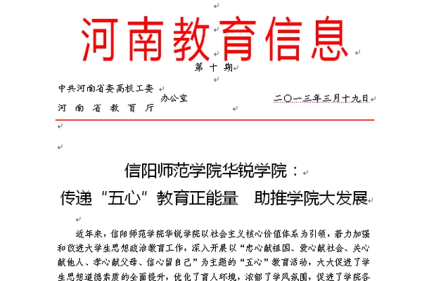 近日,由学工部张富庄老师策划,陈杰老师撰写的《信阳师范学院华锐学院:传递“五心”教育正能量 助推学院大发展》被河南省教育厅《河南教育信息》选编报道。这是我院 “五心”教育主题活动继荣获“河南省高等学校思想政治工作优秀品牌”之后首次被省级宣传媒介报道,也是我院在教育厅《河南教育信息》上刊发的第一篇品牌学生工作报道。