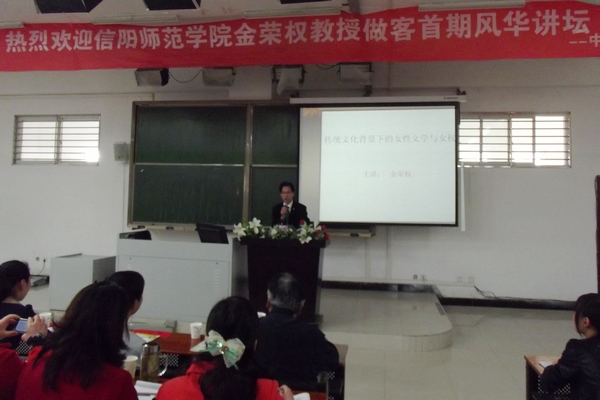 4月10日下午,中文系特邀信阳师范学院金荣权教授在图书馆102室为广大学子作了一场“传统文化背景下的女性文学与女权”的精彩报告,该系主任傅瑛与300多名师生到场聆听。