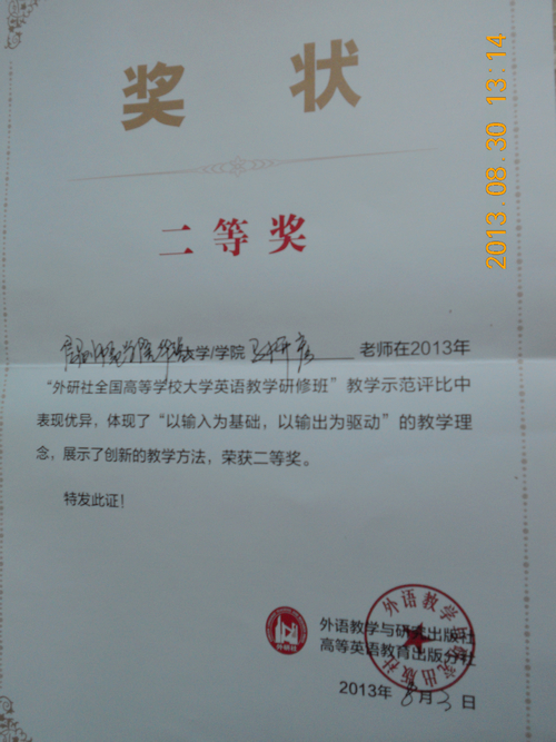 8月1日至5日,由外研社主办的2013年度全国高等学校大学英语教学研修班教学示范评比在长沙举行。来自首都师范大学、中国海洋大学、西南交通大学等100余所高校的优秀选手参加了比赛。经过激烈角逐,我院外语系教师马妍彦荣获二等奖。