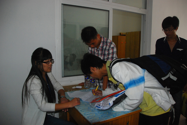 新生接待站的同学们在帮新生完成入学报到。他们十分细心地帮助新生整理有效证件,并认真指导新生入学缴费的各种细节。