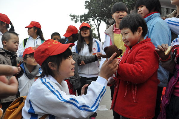 志愿者们为小朋友们带去了学习和生活用品、还有精美的小礼物,辅导他们做功课,与他们做游戏,年龄上的差距并没有给他们带去障碍,热情和爱让心靠的更近。耐心的女志愿者一遍遍地教一些智障的孩子识字、唱歌、画画,而男生则抱着小朋友在教室的上空“飞舞”,让他们体验“飞”的感觉。