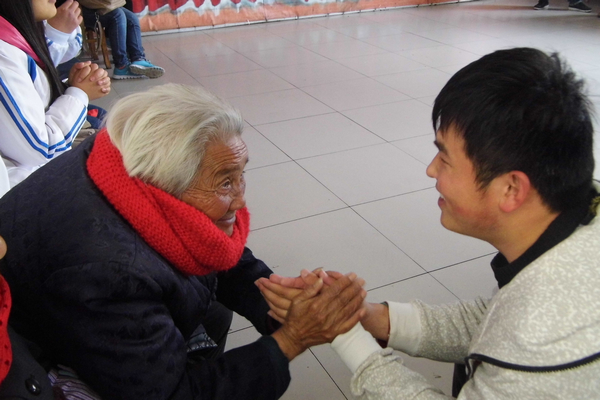 志愿者与老人们共同联欢,表演了精心准备的歌曲、戏曲、舞蹈节目如:《映山红》《在那桃花盛开的地方》《刘大哥讲话理太偏》等,精彩不断,笑声掌声连连。志愿者的到来给老人们带来了极大的欢乐,联欢时老大爷两次上台表演,意犹未尽;一位老奶奶与志愿者刘笑开同台对唱了越调《白奶奶醉酒》中的经典唱段,并嘱咐他回去学唱《鸿雁》,下次来了再一起给大家表演;一位八十五岁高龄的老奶奶还兴致勃勃地唱起了红歌;一位老奶奶看到一位志愿者穿着单薄,就连忙把自己的毛衣给她穿了上去,这个小姑娘非常感动随后就上台演唱了一首《外婆家的澎湖湾》,送给这位老奶奶。演唱中,这个女孩儿真情流露下,感动了在场的每一位老人,每一位志愿者。演出结束后,志愿者搀扶着老人到院子里晒太阳,给他们捶背聊天,每一位老人的脸上都洋溢着幸福的笑容。