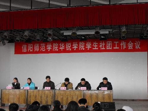 会上,外语系、中文系代表分别就社团工作经验交流了发言。郑东来老师宣读了《关于学生社团开展活动的安全管理制度》(讨论稿),社团联合会主席陈重阳同学宣读了《信阳师范学院华锐学院社团联合会2009——2010学年工作计划》。