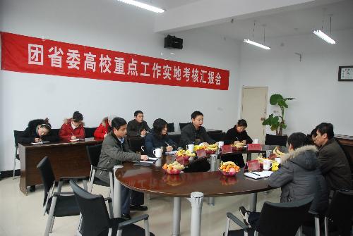 汇报会上,祝军对考核小组的到来表示欢迎,他向考核组简要介绍了我院的发展历程以及近年来学院的建设发展和共青团工作取得的成就。他指出,在团省委领导的关怀和兄弟院校的支持下,我院团委近年来的工作得以顺利开展,尤其在青年马克思主义者培养、五心教育、志愿服务、学风建设、学生日常行为管理等方面取得了显著的成绩。在今后的工作中,院党委将一如既往的支持共青团工作,鼓励各级团组织在青年成长成才中充分发挥“教育青年、引导青年、服务青年”的积极作用。