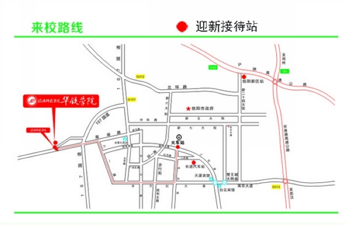 9月10日至11日,按照学校的统一部署,信阳市火车站、信阳市东站(高铁站)、信阳市长途汽车站都派有专门的新生接待车(车身印有“华锐学院”字样的大巴车),车辆运行时间:9月9日14:00-23:00,10日、11日7:30-23:00。