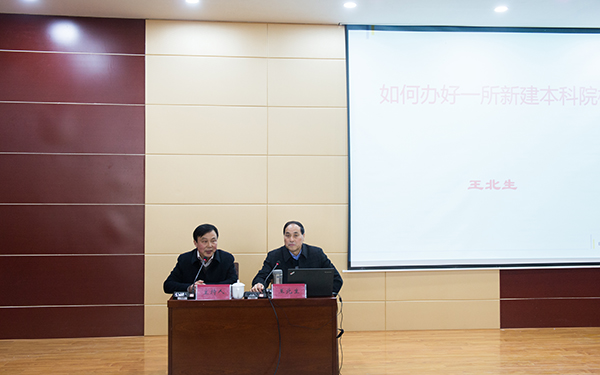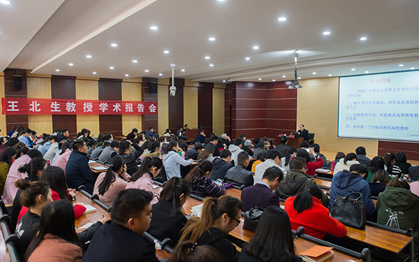 王北生教授在两个多小时的报告中,围绕如何办好新建本科院校,结合自身教学、科研和管理工作经验,运用一系列案例,从明确大学发展目标、树立现代办学理念、推进教育教学改革、培养高素质创新型人才,以及如何做一个合格的现代高校教师等方面,进行了深入阐述。他强调,高校必须牢固树立以人才培养工作为中心的办学思想,坚持以人为本,切实抓好师资队伍和专业建设,抓实教学质量工程,在提高教学质量、凝练办学特色上下足功夫。