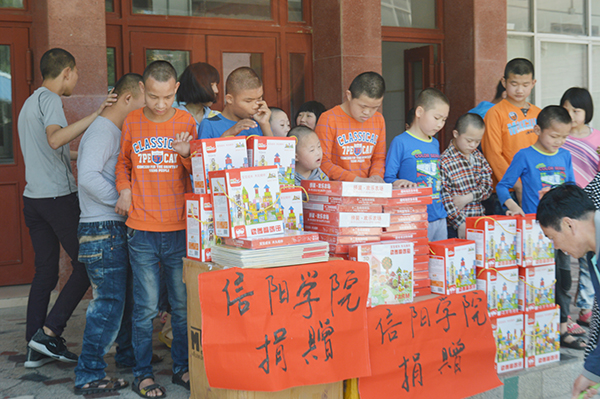 近日,我校团委副书记胡秀云和男子篮球队代表王华、胡伟、胡世奇等一行5人来到信阳市儿童福利院,捐赠一批价值2000元儿童益智玩具。