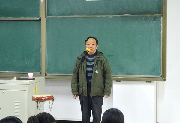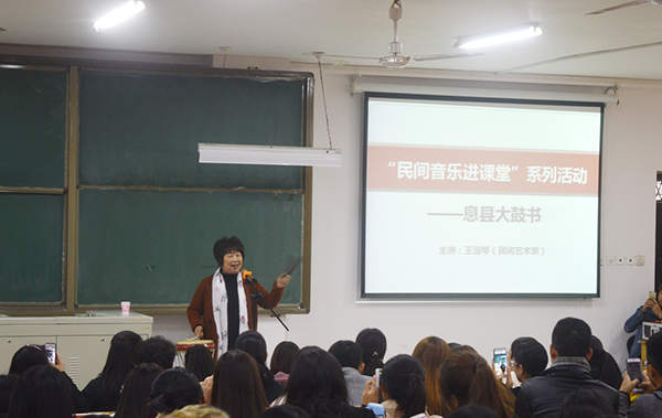 王淑琴老师现场表演了息县大鼓书——《息夫人挑灯劝君》,用边讲解、边示范的方式,对息县大鼓书的历史渊源、师承情况、表演方式及艺术特色等进行了细致诠释。王淑琴老师精彩的表演赢得了在场师生的阵阵掌声。