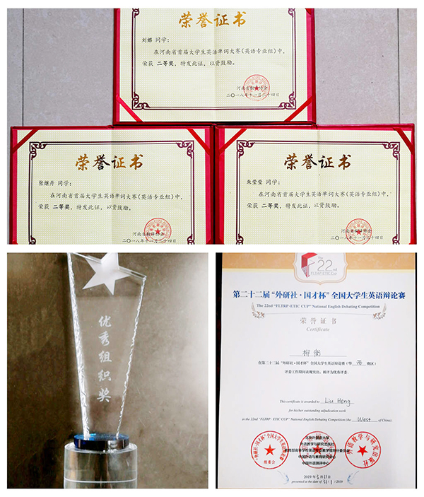 任课教师实行课内课外双轨联动,课内提高课堂教学质量,打造专业“金课”,增强课堂对学生的吸引力,课外每周一场考研、考级讲座并积极鼓励指导学生参加各类专业技能竞赛,提升学生的专业应用能力和实践创新能力。自2017年初, 外国语学院精心打造专业竞赛指导教师团队,负责对参加比赛的学生一对一指导培训,近两年共计指导120余名学生参加省级以上专业竞赛奖项80余项。其中,余兰老师指导的学生李春云荣获河南省第十五届毕业生教学技能大赛一等奖,李金慧老师指导的学生周少辉荣获河南省第十六届毕业生教学技能大赛一等奖,李静老师指导的学生王沛荣获2017年“外研社杯”全国英语写作与阅读大赛(河南赛区)一等奖。