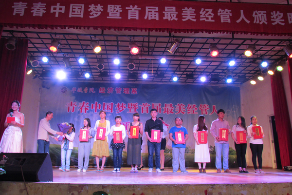 晚会中,主持人宣布了经过一个多月的申报、初评、网上投票、现场投票评选出来的经济管理系“印记青春,最美经管”首届最美经管人获奖人员名单,并对其事迹进行了简要介绍。张莉为德艺双馨的孟广章教授颁发“最美经管人特别奖”,在热烈的掌声和欢呼声中,学生代表向他献上鲜花,并表达了全系师生的爱戴之情。孟广章向获得“最美经管人”称号的2014年以总分第二名的成绩考入华东师范大学的李亚楠和执着创业、不畏艰难的“创业之星”朱龙中等8名同学和获得提名奖的刘美月等3名同学颁发了荣誉证书。