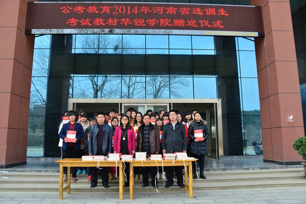 3月13日上午,河南公考教育机构在我院教四楼前广场举行2014年选调生考试教材赠送活动。公考教育考试中心主任张真玲、我院宣传部副部长陈杰、招生就业部部长助理郭二军与部分师生代表参加了该活动。公考教育机构向我院学子捐赠了100本2014年河南省选调生考试辅导教材(含行政能力测试和申论)。